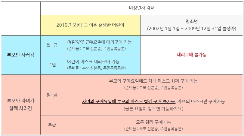 단 미성년자이나 2010년 이전 출생자의 경우는 직접 약국에 방문해야 하며 부모가 미성년자와 함께 방문시 부모 출생연도 해당 요일에 마스크 구매가 가능합니다.