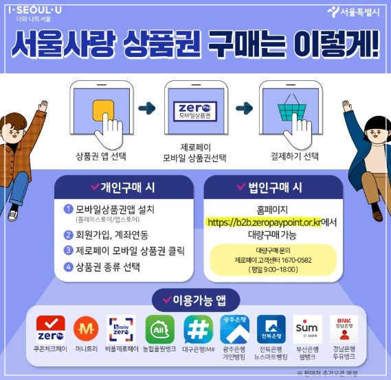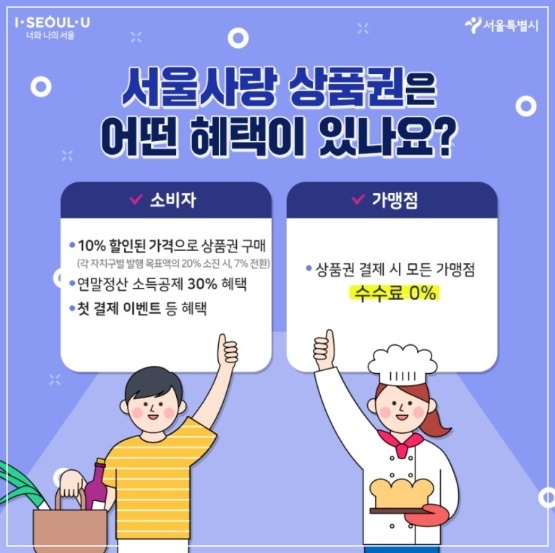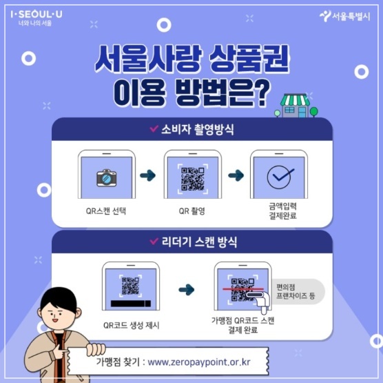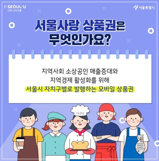 서울사랑상품권은 지역민과 소상공인 지원을 위해 각 자치구에서 발행하는 상품권으로 학원, 병원, 한의원, 약국, 재래시장뿐 아니라 파리바게뜨, 이니스프리, 정관장, 던킨도너츠 등 지역 내 대다수의 제로페이 가맹점에서 사용할 수 있습니다. GS25와 미니스톱, 이마트24, 세븐일레븐, CU 등 5대 편의점에서도 사용할 수 있습니다.