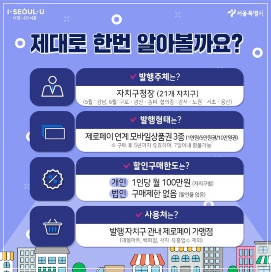 상품권은 모바일 형태로 발행되며 권종은 1만원, 5만원, 10만원 세 종류입니다. 각 자치구에서 발행된 상품권은 해당 구의 제로페이 가맹점에서 사용할 수 있으며 제로페이와 연계되어 가맹점 수수료가 없으며 소상공인에게 세제 혜택까지 제공합니다.