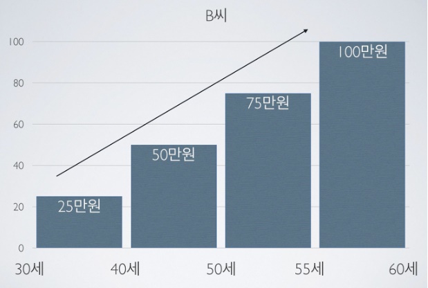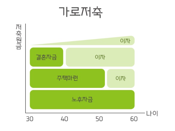 그러나 생애 주기를 고려한다면 결혼, 자녀 양육, 내 집 마련, 노후자금 등 여러 가지를 고려해 나눠서 저축하는 가로 저축이 좀 더 효율적이고 안전한 방법이라고 할 수 있겠습니다.