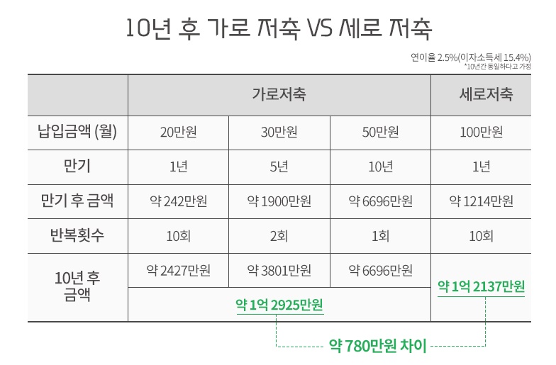 가로 저축과 세로 저축은 각각 특징이 있는데 단기적으로 돈을 빨리 모으고자 한다면 세로 저축을, 미래 계획을 통해 노후자금까지 전략적으로 모으고자 한다면 가로 저축을 택하는 것이 좋습니다.