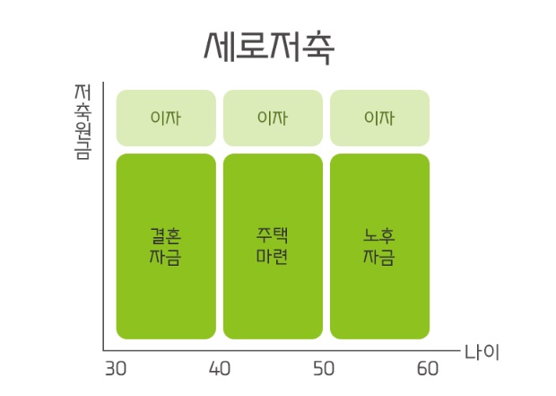 세로 저축은 한 가지의 목적을 위해 저축금액의 전부를 그때 그때 한곳에 모으는 방식입니다. 예를 들어 3년 동안 결혼자금을 위해 매월 80만원씩 저축하고, 이후 10년 동안 주택마련을 위해 매월 80만원씩, 그 이후에는 노후 자금이나 자녀 양육을 위해 저축하는 방식으로 목돈이 갑작스럽게 필요한 경우를 대비하기에 유용합니다.