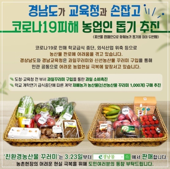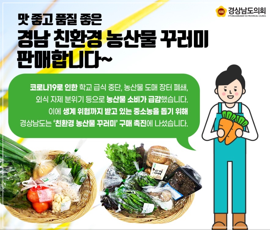 경남 친환경 농산물 꾸러미는 3월 23일부터 e경남몰에서 판매되고 있습니다. 경남 도민은 물론 누구나 친환경 농산물 꾸러미 구매가 가능합니다.