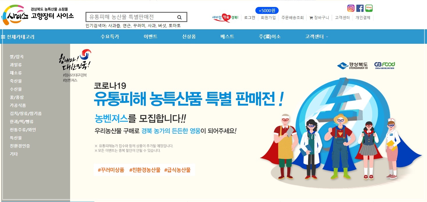 경상북도가 코로나19로 오프라인 판로가 막힌 농가들을 지원하기 위하여 농특산물 쇼핑몰 '사이소'에서 유통피해 농특산물 특별판매전을 진행하고 있으며 신선한 농특산품을 최대 40~50% 가까이 저렴한 가격에 구매할 수 있습니다.