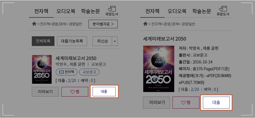 책 대여는 원하는 콘텐츠의 '대출' 버튼을 통해 대출할 수 있습니다. '대출' 버튼은 콘텐츠 목록 및 상세정보 페이지에 노출됩니다. ID 당 4회까지 대출이 가능하며, 대출한 도서는 14일 동안 이용할 수 있습니다. 14일이 지난 도서는 자동으로 반납 처리되며, 대출 완료건은 취소할 수 없습니다.