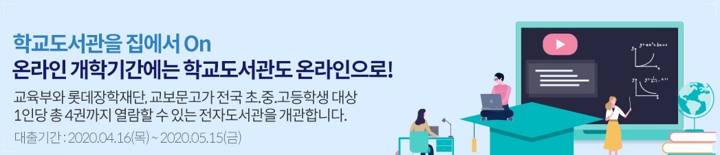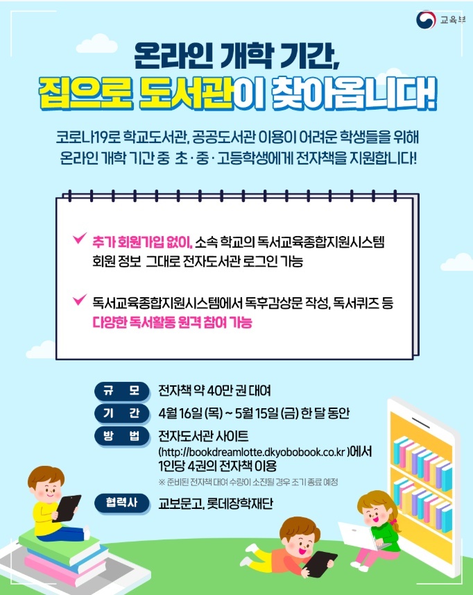 코로나19로 학교도서관, 공공도서관 이용이 어려운 학생들을 위해 온라인 개학 기간중 초ㆍ중ㆍ고등학생들에게 전자책을 지원합니다. 전자도서관 북드림을 통한 전자책 지원 서비스는 교육부의 독서교육종합시스템을 교보문고 서버와 연동해서 전국의 모든 학생들이 추가적인 회원가입없이 쉽게 열람이 가능합니다.