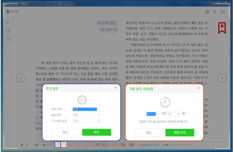 책을 귀로 읽을 수 있는 오디오북 기능이 있는데 TTS 기능이나 전체 재생 기능을 이용하면 귀로 들을 수 있습니다. 콘텐츠에 따라 지원되지 않을 수 있습니다. 오디오북 기능은 PC와 모바일 모두 지원가능합니다.