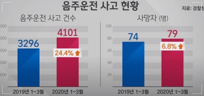 코로나19의 발생으로 호흡을 해야하는 음주 단속이 그동안 줄어들었습니다. 신종 코로나바이러스 감염증(코로나19) 전파 우려로 경찰의 음주운전 단속 방식이 다소 느슨해지자 사회적 거리 두기에도 불구하고 음주운전 사고와 사망자가 늘어난 것으로 나타났습니다.