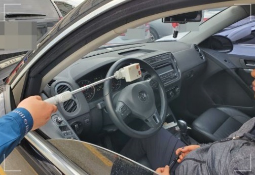 운전자 얼굴로부터 약 30㎝ 떨어진 곳에서 약 5초에 걸쳐 호흡 중에 나오는 성분을 분석해 술을 마셨는지를 판별하는 비접촉 음주단속을 실시합니다. 음주 사실이 감지되면 램프가 깜빡이고 경고음이 나옵니다.
