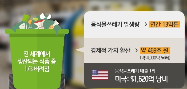 환경부에 따르면 전국에서 하루에 버려지는 음식물 쓰레기양은 평균 1만4477t에 이른다고 합니다. 음식물 쓰레기는 80% 이상의 수분을 함유하고 있으며 쉽게 부패되고 모기 등의 해충번식을 유발할 수 있어 음식물쓰레기 처리 비용으로만 연간 약 2조 원이 투입되고 있습니다.