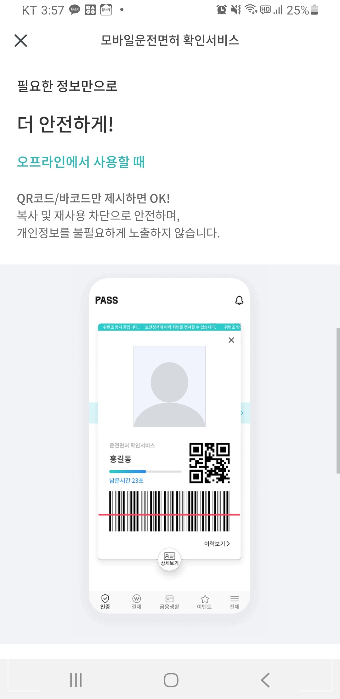 이통3사는 경찰청 운전면허 시스템을 연동해 경찰청과 도로교통공단에 등록된 실제 면허증 사진이 앱에 등록되도록 했습니다. 이에 모바일에 타인의 정보를 허위로 위조해사용하려는 시도를 원천 차단했습니다.