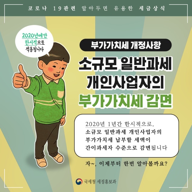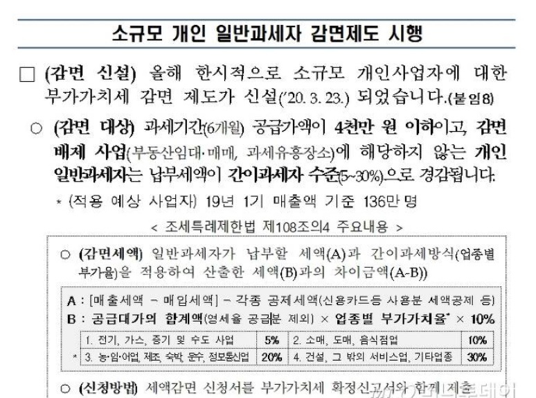 소규모 개인사업자에 대한 부가가치세 감면 제도가 2020년 3월23일에 신설됐습니다. 감면 대상은 과세기간(6개월) 공급가액이 4000만원 이하인 개인 일반과세자로 이들은 납부세액이 간이과세자 수준(5~30%)으로 경감됩니다.