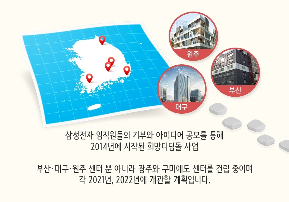 앞으로는 시설과 프로그램 지원뿐만 아니라 희망하는 청소년 대상으로 삼성전자 임직원과의 멘토링 등도 진행할 예정입니다. 삼성전자는 삼성 희망디딤돌 센터를 부산·대구·원주·광주·구미 등 5개 지역에 짓는 1기 사업을 현재 진행 중입니다.