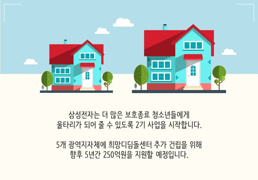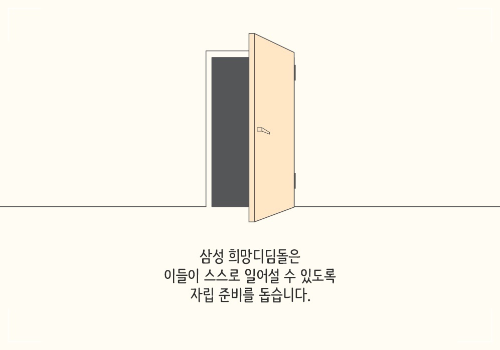 삼성전자는 신경영 선언 20주년이었던 2013년부터 임직원들이 기부한 돈으로 보호종료 청소년들에게 주거공간, 교육 등을 제공해서 자립을 돕는 삼성 희망디딤돌 프로그램을 운영하고 있습니다.