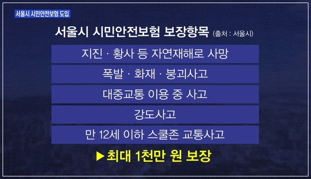 서울시는 이달부터 자연재난이나 화재, 붕괴 등의 피해자에게 보험금을 지급하는 ‘시민안전보험’을 시행한다고 2일 밝혔습니다. 시와 계약을 체결한 보험기관에서 최대 1000만원의 보험금을 지급합니다. 서울에 주민등록이 돼 있는 시민(등록외국인 포함)이라면 누구나 자동으로 가입되며 별도의 가입 절차 없이 사고 당시 서울시에 주민등록이 돼 있는 시민이 대상으로 이번 달부터 적용됩니다.