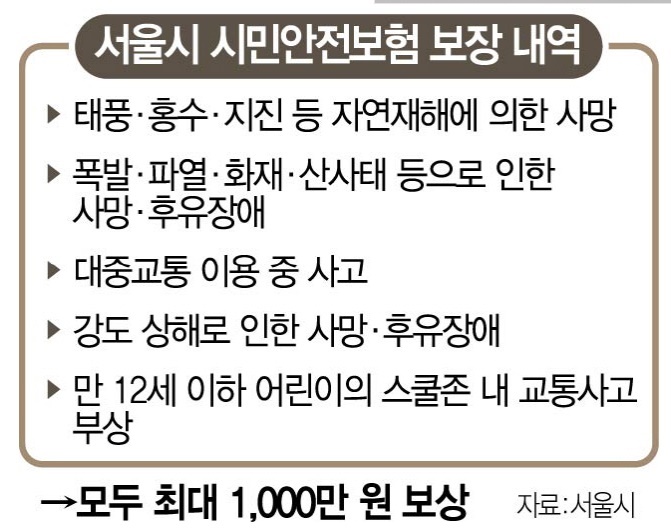서울시가 재난이나 사고로 피해를 입은 시민에게 최대 1000만원의 보험금을 지급합니다. 자연재난이나 화재, 붕괴 사고처럼 안전사고로 피해를 본 시민은 최대 천만 원의 보험금을 서울시와 계약한 보험사에서 받을 수 있습니다.