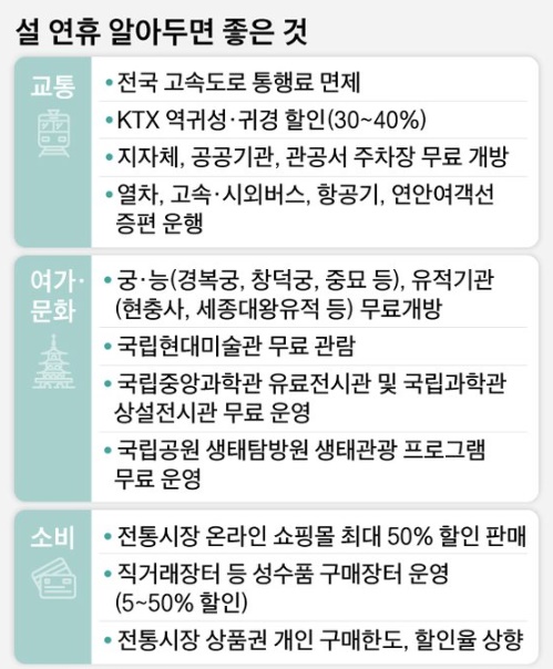 정부는 예년과 마찬가지로 이달 24~26일 귀성·귀경객의 교통 편의를 위해 전국 고속도로 통행료를 면제합니다. 이 기간 지방에서 서울로 역 귀성하는 하는 KTX 좌석표를 구매하면 30~40%의 할인 혜택도 제공하기로 했습니다. 코레일은 과거 설 KTX 이용 패턴과 수요 집중 현황을 분석해 이용객이 적을 것으로 예상되는 열차 292개를 선정, 특가 판매를 진행할 예정입니다.
