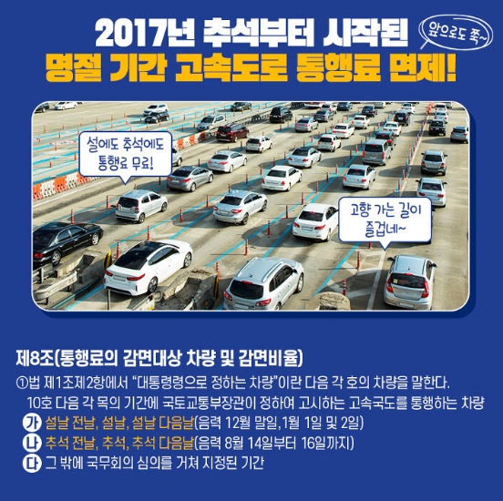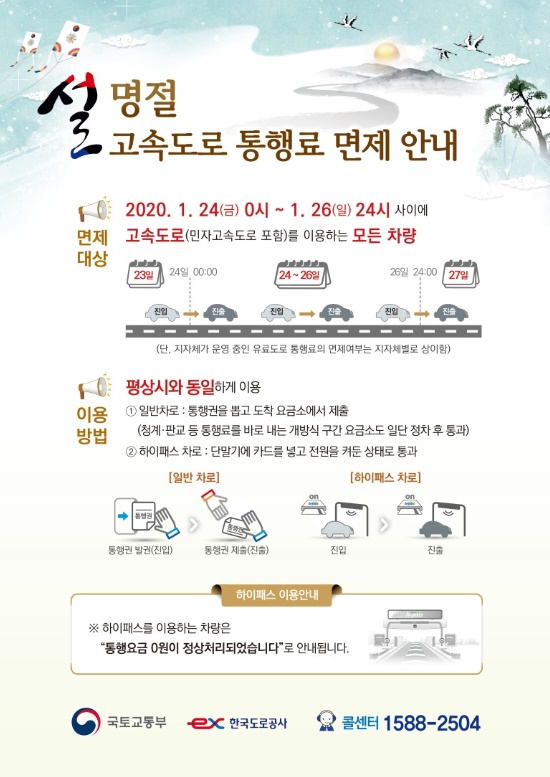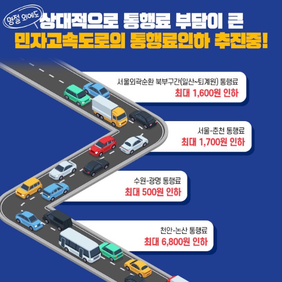 올해 설 명절 기간 전국 고속도로 통행료를 면제됩니다. 또 지방에서 고속철도(KTX)를 이용해 서울로 역(逆) 귀성하면 운임의 40%를 할인받을 수 있습니다. 고속철도(KTX) 역(逆)귀성 시 최대 40% 할인 혜택을 제공합니다. 정부는 7일 오전 정부서울청사에서 국무회의를 열어 이 같은 내용의 관계부처 합동 설 민생안정대책을 확정했다고 밝혔습니다.