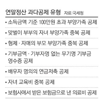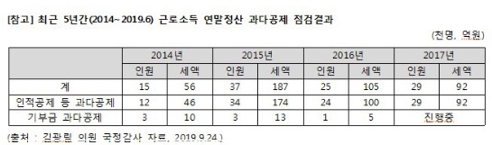 2019년 국정감사 자료에 따르면 연말정산 신고자에 대한 인적공제 등 과다공제자는 2015년 3만4000명, 2016년 2만4000명, 2017년 2만9000명인 것으로 집계됐습니다. 인적공제는 근로자 본인과 연간 소득금액 100만원 이하인 배우자, 생계를 같이 하는 부양가족에 대해 1명당 150만원을 공제해주는 제도입니다. 소득금액은 부모님이나 배우자 등 부양가족의 총소득에서 비과세소득과 분리과세소득, 필요경비를 제외한 금액이며 소득금액 100만원이 넘으면 연말정산때 부양가족 기본공제를 받을 수 없습니다.