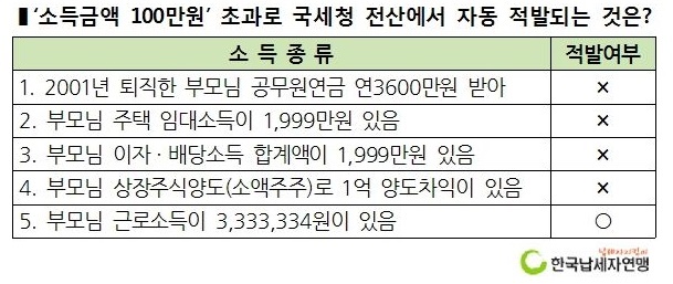 근로자들이 연말정산때 인적공제의 기준이 되는 ‘소득금액 100만원’을 잘못 적용해 이후 부당공제로 적발되는 사례가 많아 주의가 요구됩니다. 16일 한국납세자연맹에 따르면 ‘소득금액 100만원’의 개념 때문에 해마다 2만명 이상의 근로자들이 인적공제 과다에 따른 가산세 등 불이익 처분을 받고 있습니다.