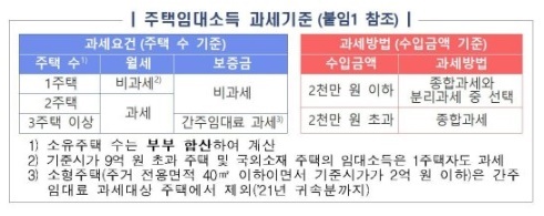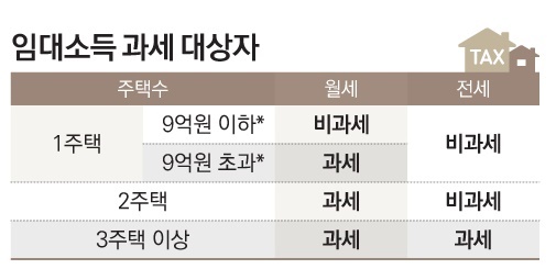 주택임대소득 과세 대상은 월세 수입이 있는 2주택자 이상과 보증금 합계가 3억 원을 초과하는 3주택자 이상입니다. 주택수는 부부합산 기준으로 시세가 9억 원을 넘는 주택이나 해외 소재 주택의 임대소득은 1주택자 또한 과세대상입니다. 단 전용면적 40㎡ 이하이면서 시세가 2억 원 이하인 경우 내년 귀속분까지 과세 대상에서 제외됩니다.