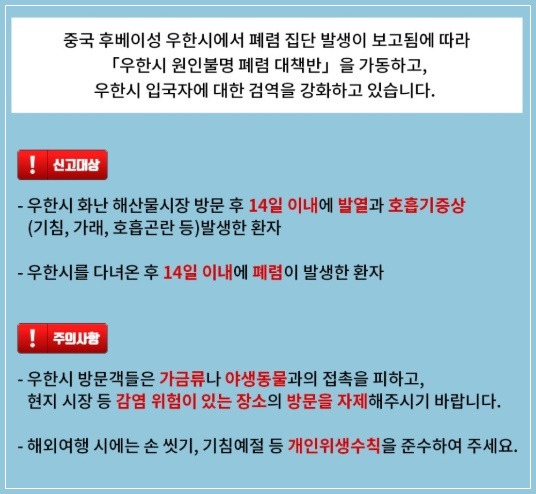 우한 폐렴의 확산을 막으려면 의료진 협조도 필수입니다. 무엇보다 우한시 등 해외여행을 다녀온 것으로 확인한 환자에게 이상증상이 없는지 증상을 꼼꼼히 확인하는 게 중요합니다. 우한시를 다녀온 후 14일 동안 열이 37.5도 이상으로 오르고 기침을 하지 않는지, 폐렴 증상 등을 확인해야 합니다.