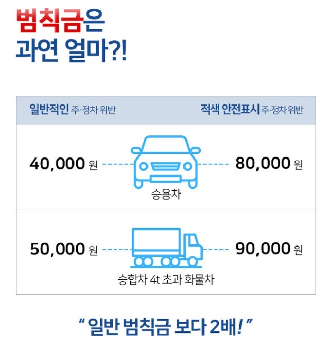 주·정차한 승용차에는 일반 주·정차위반보다 2배가량 많은 8만 원, 승합차는 9만 원의 범칙금과 과태료를 부과할 수 있습니다. 4월 17일부터는 ‘불법 주정차 주민신고제’도 시행되고 있습니다. 주민이 스마트폰 앱을 활용해 적색 안전표시에 불법 주·정차된 차량을 신고하면, 공무원의 현장적발 없이도 과태료가 부과됩니다.