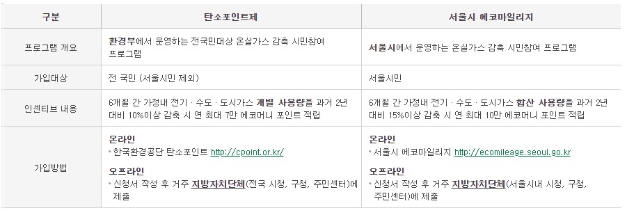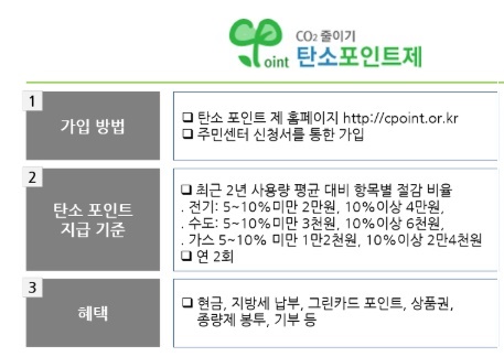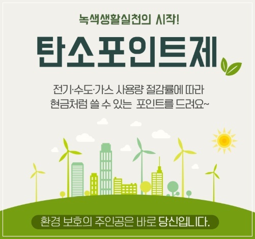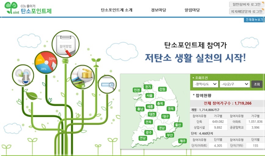 에코마일리지가 서울시민의 특권이라면 서울을 제외한 16개 시ㆍ도 주민들은 환경부의 탄소포인트제를 이용하면 됩니다. 탄소포인트제란 가정이나 상업 시설에서 전기, 수도, 가스(지역난방)등의 사용량을 절감해 실적에 따라 탄소 포인트를 지방자치단체에서 1포인트당 3원 이내 인센티브로 제공하는 제도입니다. 현재 180만여가구가 참여하고 있습니다.