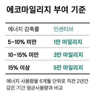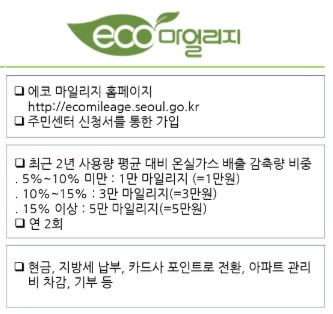 에너지 사용량을 6개월 단위로 직전 2년 동안 같은 기간의 평균 사용량과 비교해 5% 이상 줄이면 1만~10만 마일리지를 차등 지급한다. 1마일리지를 1원처럼 쓸 수 있다. 지방세나 아파트 관리비를 내거나 온누리상품권, 문화상품권, 티머니 충전 등에 사용할 수 있다. 마일리지로 기부를 하면 연말에 소득공제 혜택도 받는다. 에너지를 절약하면서 환경을 보호하고, 돈도 버는 일석삼조 효과를 내면서 각광을 받고 있습니다.