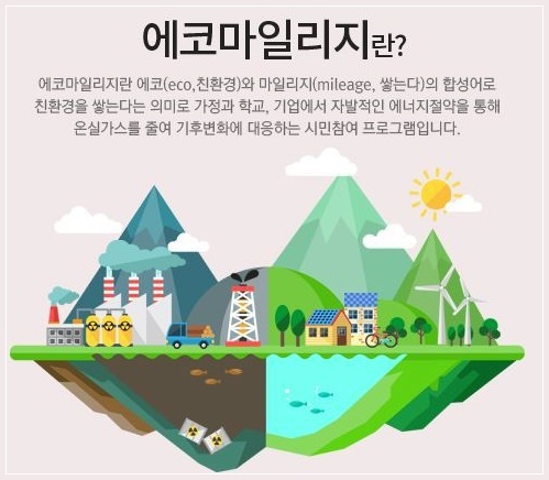 현재 가장 심각한 지구온난화 문제를 해결할 수 있는 근본적인 방법은 온실가스 배출량을 줄이는 것인데, 에코마일리지 가입으로 환경보호에 대한 의식개선은 물론 실생활에서 지구온난화를 직접 줄이는 실생활실천운동을 할 수 있다고 합니다.