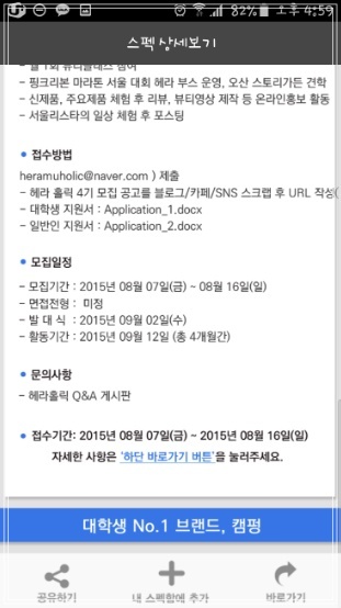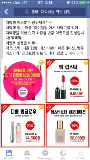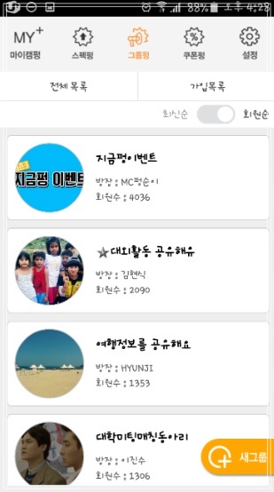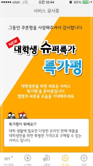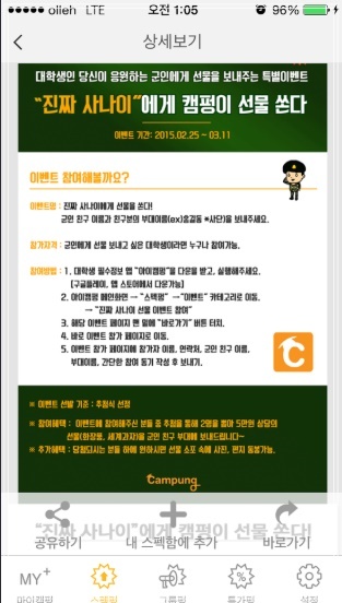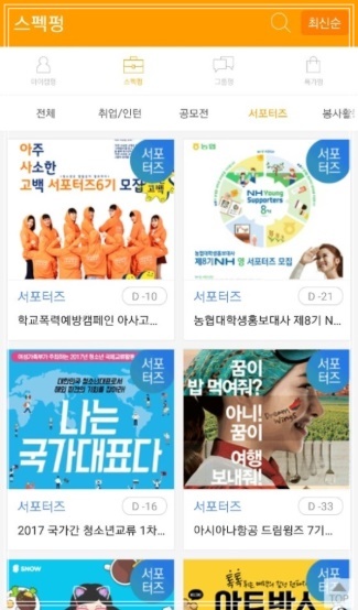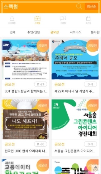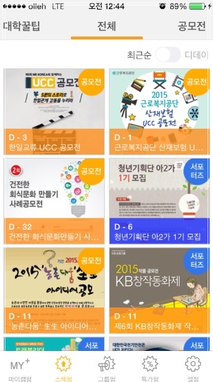 아이캠펑은 대학생이 알차고 편리한 생활을 누리기 위한 모든 정보가 담겨있는 앱으로 스펙펑, 그룹펑, 특가펑, 마이캠펑으로 이루어져 있습니다. 스펙펑에서는 각 종 대학 꿀팁과 취업, 인턴, 공모전, 서포터즈, 그리고 봉사활동까지 모든 스펙정보를 모아볼 수 있는데 알찬 포트폴리오 만들기에 최적입니다. 그룹펑에는 모든 능력자 인싸들이 모였다.