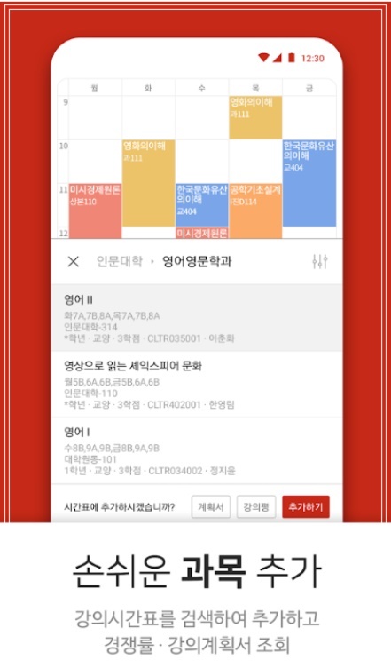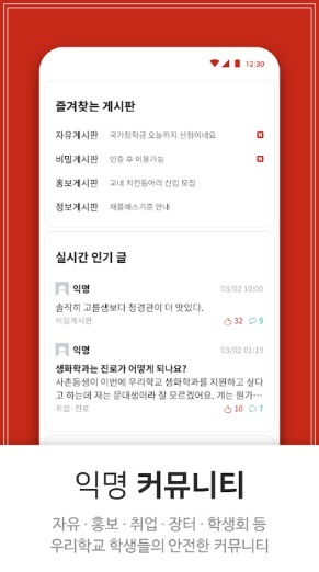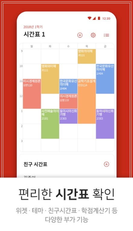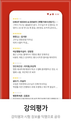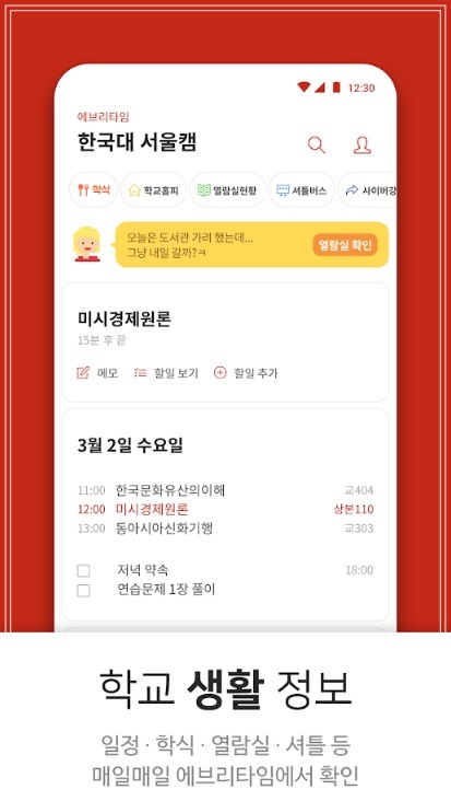 '에브리타임'은 학교 홈페이지, 학식, 도서관 및 열람실, 셔틀버스 등 대학생활에 꼭 필요한 정보를 제공하며, 시간표 작성과 수업 일정 및 할 일, 학점 계산기 등을 지원해 학업 관리를 편리하게 할 수 있는 앱입니다. 또한 학교 인증을 할 경우 같은 캠퍼스 학생들이 활발하게 활동하는 익명 커뮤니티를 이용할 수 있는데, 이곳에서 강의 및 학교생활과 관련된 다양한 정보를 얻을 수 있습니다. 또 수강했던 학생의 리뷰에서 수업의 실질적인 부분을 알 수 있는데 수업 방법부터 과제는 몇 번, 어떤 식이고 어떻게 평가하는지 말이다. 낮은 평점에는 다 이유가 있으니 수강신청 전 꼼꼼하게 체크하면 도움이 됩니다.
