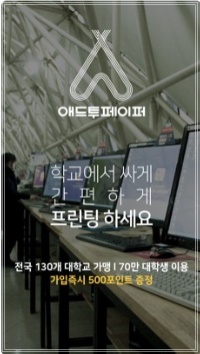 애드투페이퍼는 앱에서 충전한 프린팅 포인트를 통해 학교 곳곳에서 프린트를 이용할 수 있는 앱입니다. 애드투페이퍼가 설치된 전국 130여개 대학교의 복사실에 자신의 학교도 포함되어 있는지 보려면 앱 안의 ‘프링틴 존’을 보면 됩니다. 애드투페이퍼는 현금이나 카드를 들고 오지 않아도 결제가 가능하고 이벤트를 통해 추가 애딧을 충전해준다는 장점이 있습니다. 또한 교수님이 올려주신 ppt를 프린트해가야 하는 일이 많은 대학생들은 이벤트를 통해 추가 애딧을 충전하면 프린트 비용을 줄일 수도 있습니다.