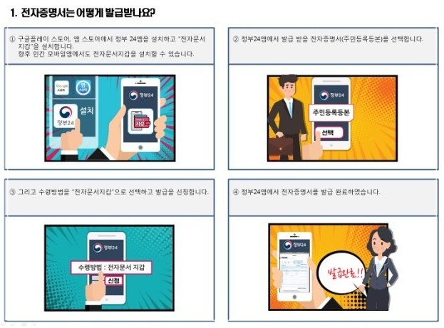 전자증명서는 각종 증명서 또는 확인서 제출을 위해 기관을 방문하는 불편뿐만 아니라 우편·팩스·사진전송 등의 과정에서 발생할 수 있는 개인정보 유출을 방지하기 위해 지난 해 마련됐습니다. 먼저 지난 달 18일부터 올해 3월 말까지 종이문서 발급양이 가장 많은 주민등록등·초본을 대상으로 발급·제출 서비스를 시행하고 있습니다.
