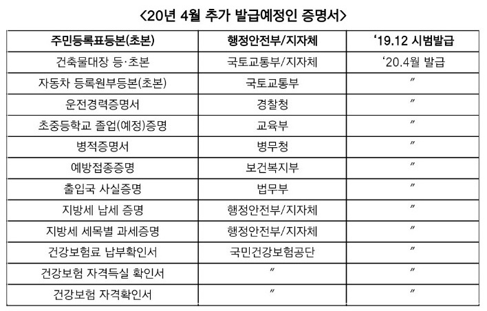 전자증명서는 병적증명서, 출입국사실증명, 건강보험료납부확인서, 건강보험자격득실확인서, 건강보험자격확인서, 지방세납세증명, 지방세세목별과세증명, 건축물대장등·초본, 자동차등록원부등본(초본), 운전경력증명서, 초중등학교졸업(예정)증명, 예방접종증명이 새로 포함됐습니다. 행안부는 올해 말까지 전자증명서 발급 대상 증명서를 100종으로 확대합니다.