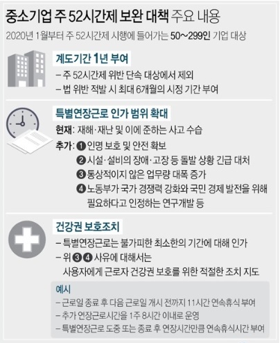 정부는 지난달 말 근로기준법 시행규칙을 개정해 특별연장근로의 5가지 기준을 만들었지만 경제계는 '국가재난'과 '인명보호 등 긴급조치'를 빼면 하나 같이 기준이 모호하다고 지적하고 있습니다. 특별연장근로 허용 범위가 '돌발상황'이나 '통상적이지 않은 경우' 등 구체적이지 않고 두루뭉술합니다. 연장근무가 급한 기업들이 불확실한 기준 탓에 우려와 걱정 속에 의사결정을 하지 못할 수 있다는 우려가 나옵니다.