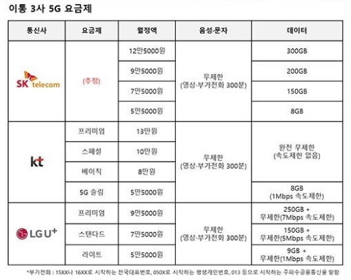 SK텔레콤과 LG유플러스는 7만5000원 요금제의 경우 혜택 상향없이 5G 데이터 150GB 제공을 유지합니다. 무제한으로 데이터를 제공하지 않아도 KT의 베이직(8만원) 요금제 대비 경쟁력이 충분하다는 판단입니다.