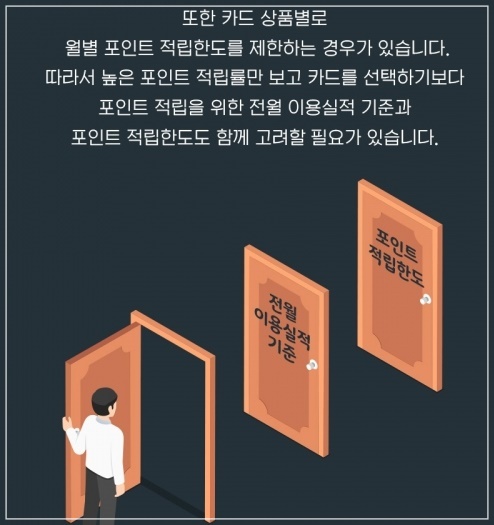 또한 카드 상품별로 월별 포인트 적립한도를 제한하는 경우가 있습니다. 따라서 높은 포인트 적립률만 보고 카드를 선택하기보다 포인트 적립을 위한 전월 이용실적 기준과 포인트 적립한도도 함께 고려할 필요가 있습니다.세금, 무이자할부 등 일부 결제는 전월 이용실적에서 제외되거나 포인트가 적립되지 않으니 유의해야 합니다.