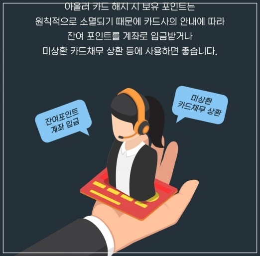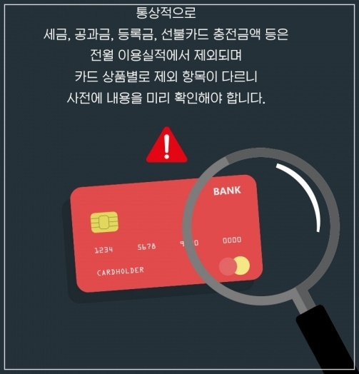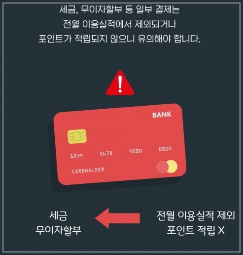 통상적으로 세금, 공과금, 등록금, 선불카드 충전금액 등은 전월 이용실적에서 제외되며 카드 상품별로 제외 항목이 다르니 사전에 내용을 미리 확인해야 합니다.아울러 카드 해지 시 보유 포인트는 원칙적으로 소멸되기 때문에 카드사의 안내에 따라 잔여 포인트를 계좌로 입금받거나 미상환 카드채무 상환 등에 사용하면 좋습니다.