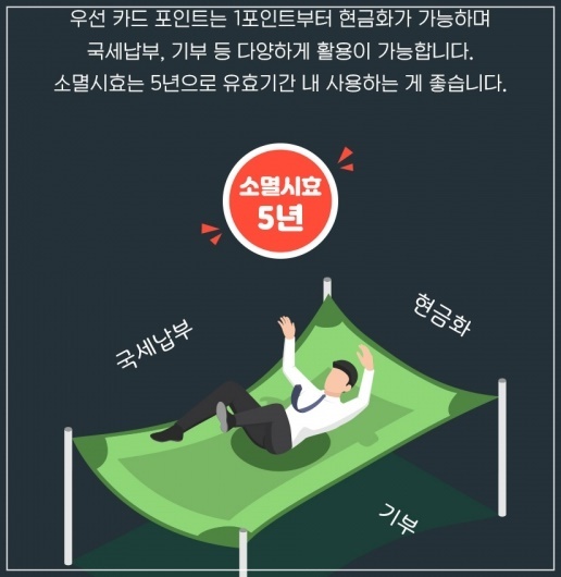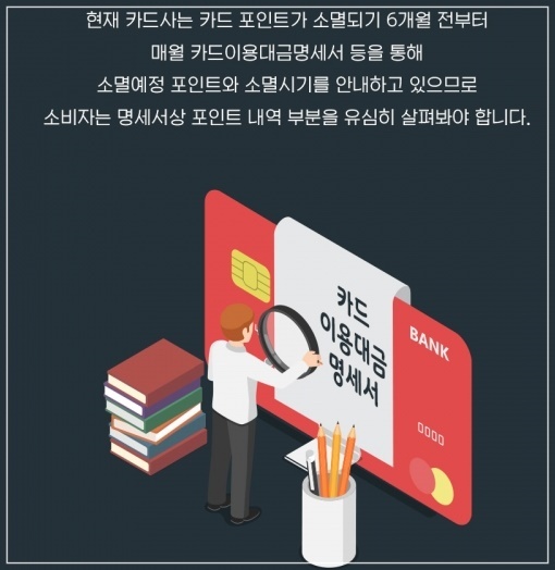 우선 카드 포인트는 1포인트부터 현금화가 가능하며 국세납부, 기부 등 다양하게 활용이 가능합니다. 소멸시효는 5년으로 유효기간 내 사용하는 게 좋습니다. 현재 카드사는 카드 포인트가 소멸되기 6개월 전부터 매월 카드이용대금명세서 등을 통해 소멸예정 포인트와 소멸시기를 안내하고 있으므로 소비자는 명세서상 포인트 내역 부분을 유심히 살펴봐야 합니다.