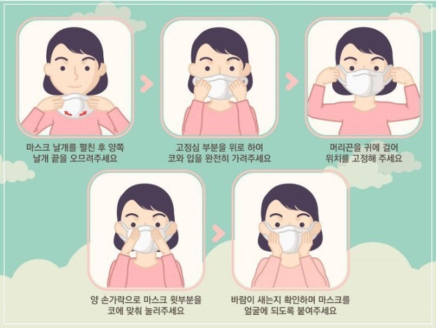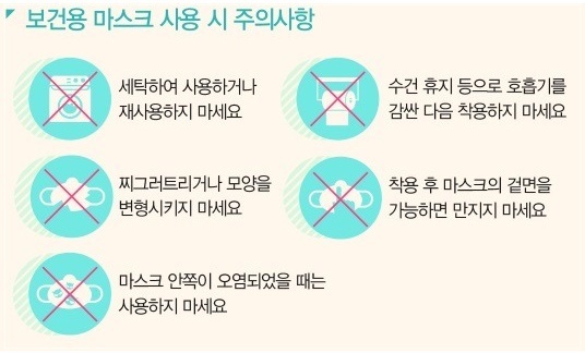 마스크 사용 시 주의사항도 있습니다. 아깝다고 세탁해서 다시 사용하면 효과가 없고, 대체로 하루정도 사용하면 버리는 것이 좋습니다. 또 마스크의 귀에 거는 부분 외에는 손으로 만지지 않는 게 중요합니다.