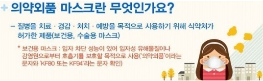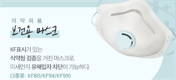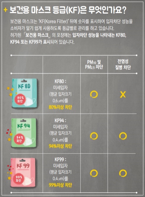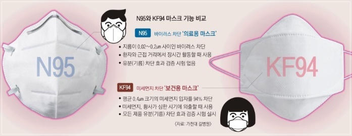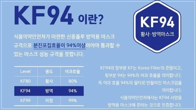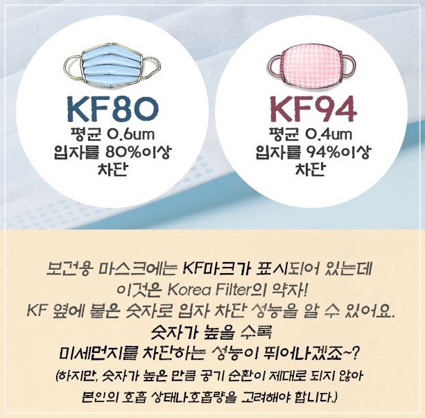 보건용마스크 종류는 'KF80', 'KF94', 'KF99'가 있다. KF는 ‘Korea Filter’라는 의미로 N95 마스크와 KF94 마스크는 국가별로 사용하는 기준이 다른 것일 뿐, 기능 면에서는 거의 동일합니다. KF94는 평균 0.4㎛ 크기의 입자를 94% 이상 차단하며 KF80은 0.6㎛ 크기의 입자를 80% 이상 차단합니다.