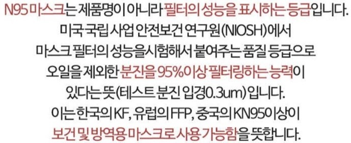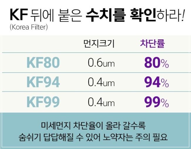 시중에 판매되고 있는 마스크는 KF80, KF94, N95 등등 각각 등급이 있어 그 등급에 따른 기능과 효과를 잘 확인하고 상황에 맞게 선택해 착용하는 게 좋습니다.