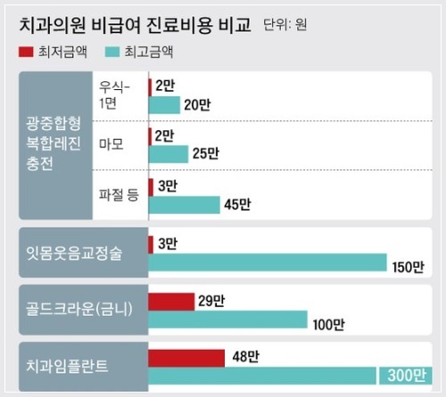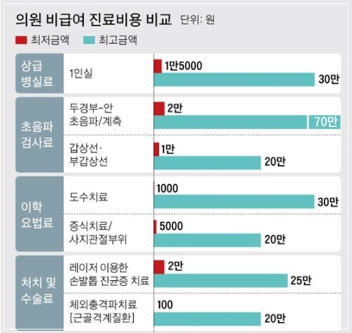 공개 내용도 단순히 가격에 그치지 않고 어떤 질병·수술에서 얼마나 비급여 진료비용이 발생했는지 등 구체적인 정보 위주로 공개합니다. 복지부와 건강보험심사평가원이 지난 9월 전국 3000개 동네의원의 비급여 진료 비용을 조사한 결과 도수치료의 경우 1만~30만원, 치아 임플란트는 최저 48만~300만원, 추나요법은 1만~12만원 등 의원별로 비용 차이가 컸습니다.