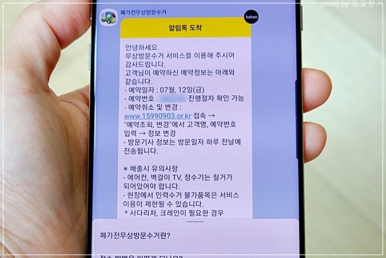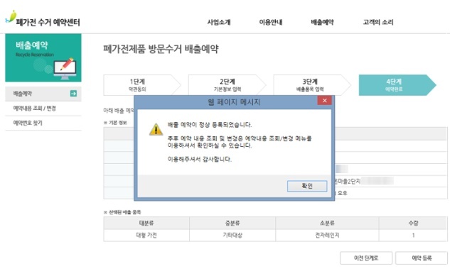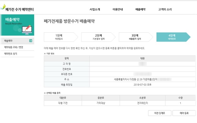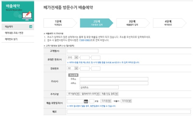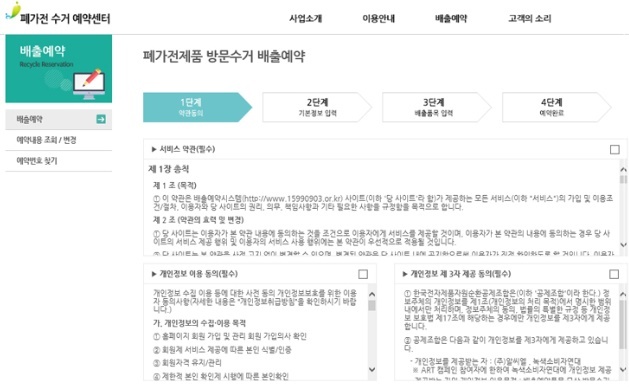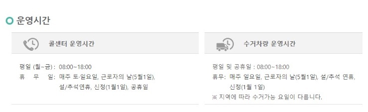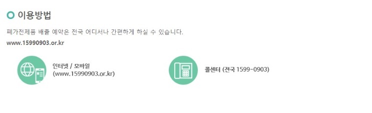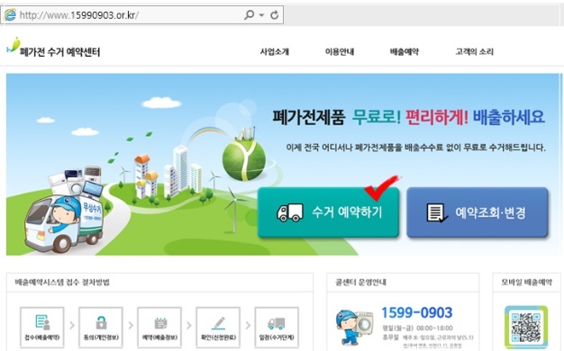 수거예약은 홈페이지와 콜센터에서 예약할 수 있는데 콜센터 1599-0903 에서 평일 08시~18시, 토요일‧공휴일은 8시~12시까지 운영하며 매주 일요일, 1월 1일, 5월 1일, 설‧추석 연휴는 휴무입니다. 홈페이지는 http://www.15990903.or.kr 또는 www.edtd.co.kr에서 예약이 가능하며 전국(섬은 제주특별자치도만 가능)에서도 서비스를 이용할 수 있습니다. 또한 SNS 카카오톡에서도 신청이 가능합니다.