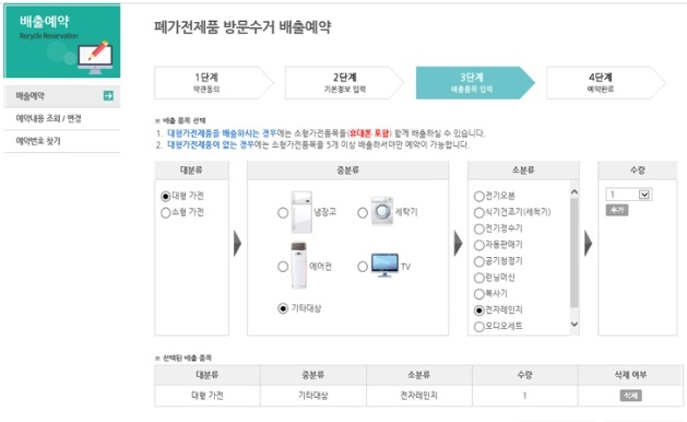 폐가전 방문수거 서비스를 신청할 때 대형가전의 경우는 1개 이상이면 예약이 가능하지만, 소형가전만 신청하려면 5개 이상을 배출하셔야 예약이 가능합니다. 하지만 수거 제외 대상도 있으니 미리 참고하시는게 좋습니다.
