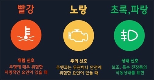 경고등은 기본적으로 세가지 색으로 뜨게 되는데 파란색 경고등은 현재 상태나 작동 중인 장치를 알려주는 경고등입니다. 노랑색 경고등은 경고를 의미하는 주의신호로 자동차 주행과는 무관하지만 점검이 필요하다는 상태를 의미합니다. 특히 빨강색 경고등은 주행하기에 안전하지 않다는 신호로 최대한 신속히 즉각적으로 대처해야 합니다.