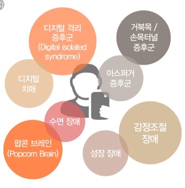 스몸비는 스마트폰만 들여다 보는 행동, IAD는 인터넷을 하지 않으면 금단 현상과 일상생활 장애 등의 증상을 보이는 질병, 팝콘브레인은 뇌 구조가 아예 변형된 상태를 말합니다. 실제로 인터넷을 장시간 사용한 사람의 뇌를 촬영한 자기공명영상(MRI) 분석결과, 인간의 뇌에서 생각 중추를 담당하는 회백질의 크기가 줄어든 것으로 조사됐습니다. 이는 팝콘처럼 곧바로 튀어 오르는 즉각적인 현상에만 반응할 뿐 다른 사람의 감정 또는 느리고 무던하게 변화하는 현실에는 무감각하게 된다는 의미입니다.