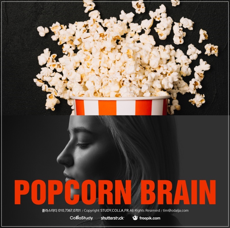 스마트폰을 통한 인터넷 서핑은 일상입니다. 무엇이든 적당히 해야 하는데 지나치면 문제가 됩니다. 인터넷이 대표적입니다. 디지털 기기의 발달로 어디서든 인터넷을 접할 수 있게 되면서 '스몸비(Smombie)', '인터넷 중독 장애(IAD)' 등의 용어가 등장했는데 IAD와 함께 심각한 위협이 되는 것이 '팝콘브레인(Popcorn Brain)'입니다.