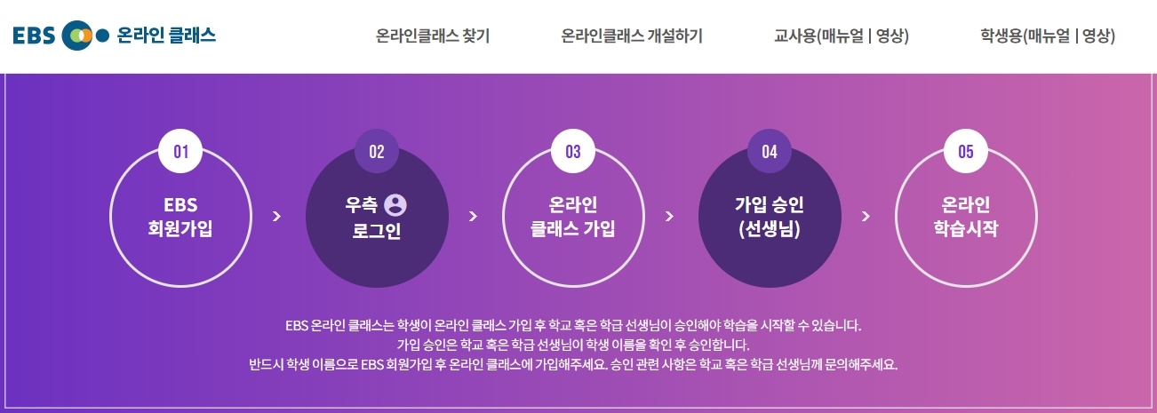 온라인클래스는 학급별로 클래스를 개설하여 그 반의 학생이 클래스에 가입 신청을 하면 강좌를 수강할 수 있습니다. 학생이 가입을 하면 선생님이 승인을 해주면 온라인 강의를 들을 수 있습니다.